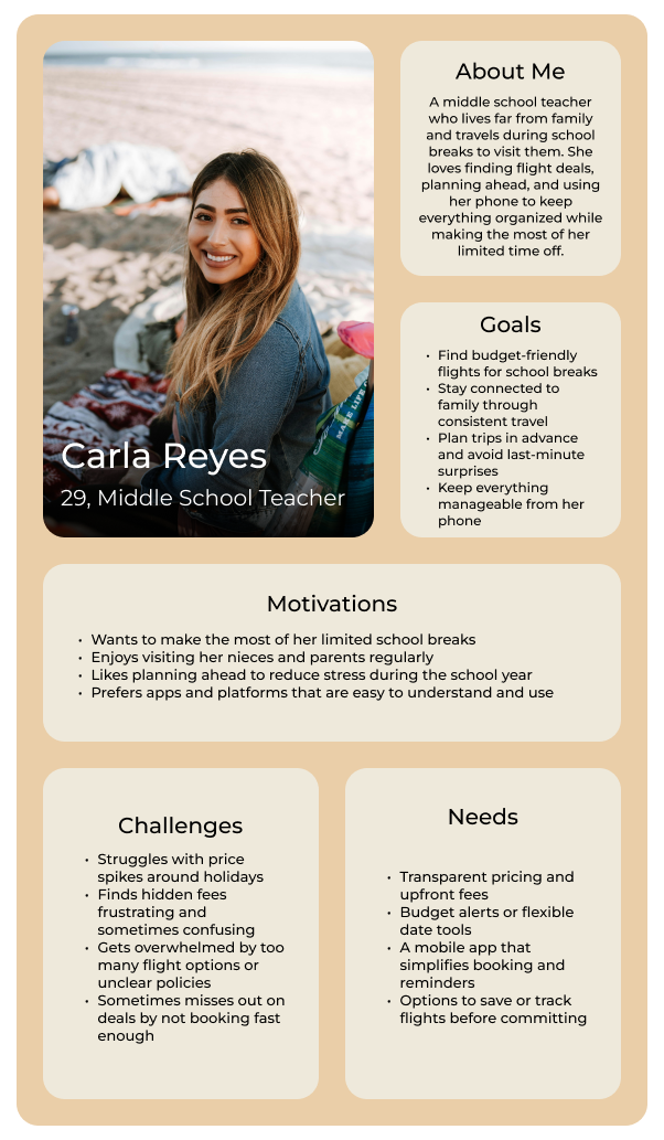 User feedback played a central role in shaping each design decision, helping us align the flow with how travelers naturally search for, compare, and purchase flights. To establish a strong foundation, we created detailed user personas, mapped booking journeys, and outlined user flows, which guided both the structure and functionality of the redesign. These deliverables ensured that each step, from flight selection to checkout, was intuitive, efficient, and transparent, ultimately reducing friction and helping users feel more confident throughout the process.